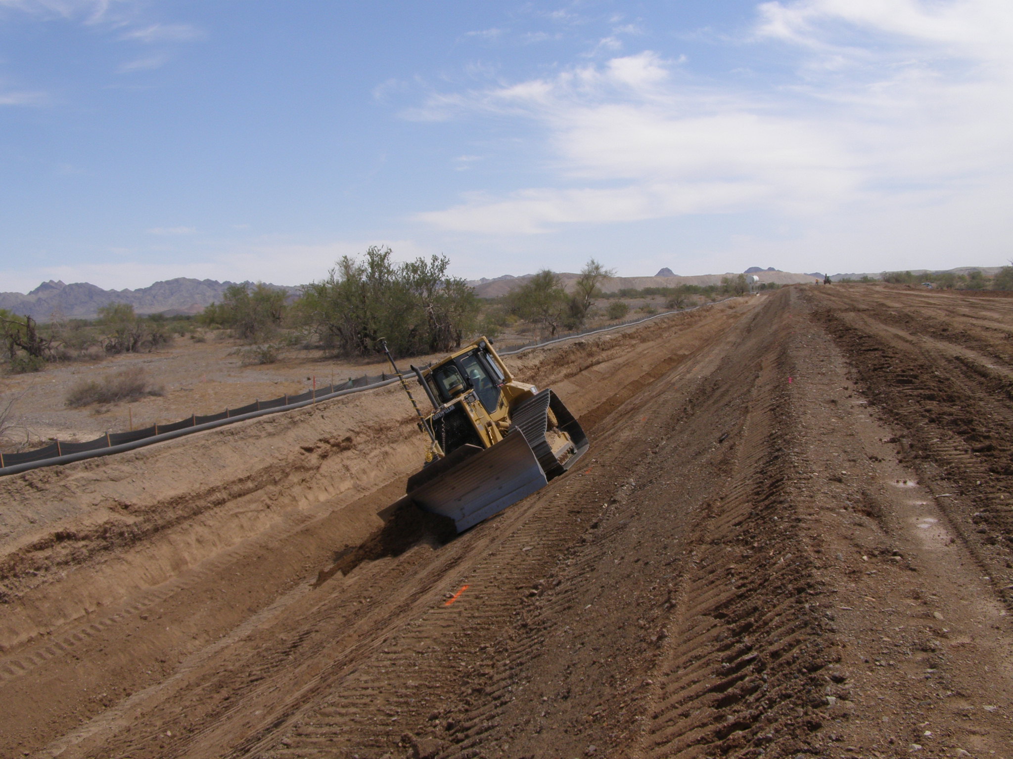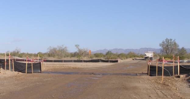 April 2010 A temporary berm is built in a drainage channel to provide access during the construction of the rail spur bridge leading into the Mesquite Regional Landfill.