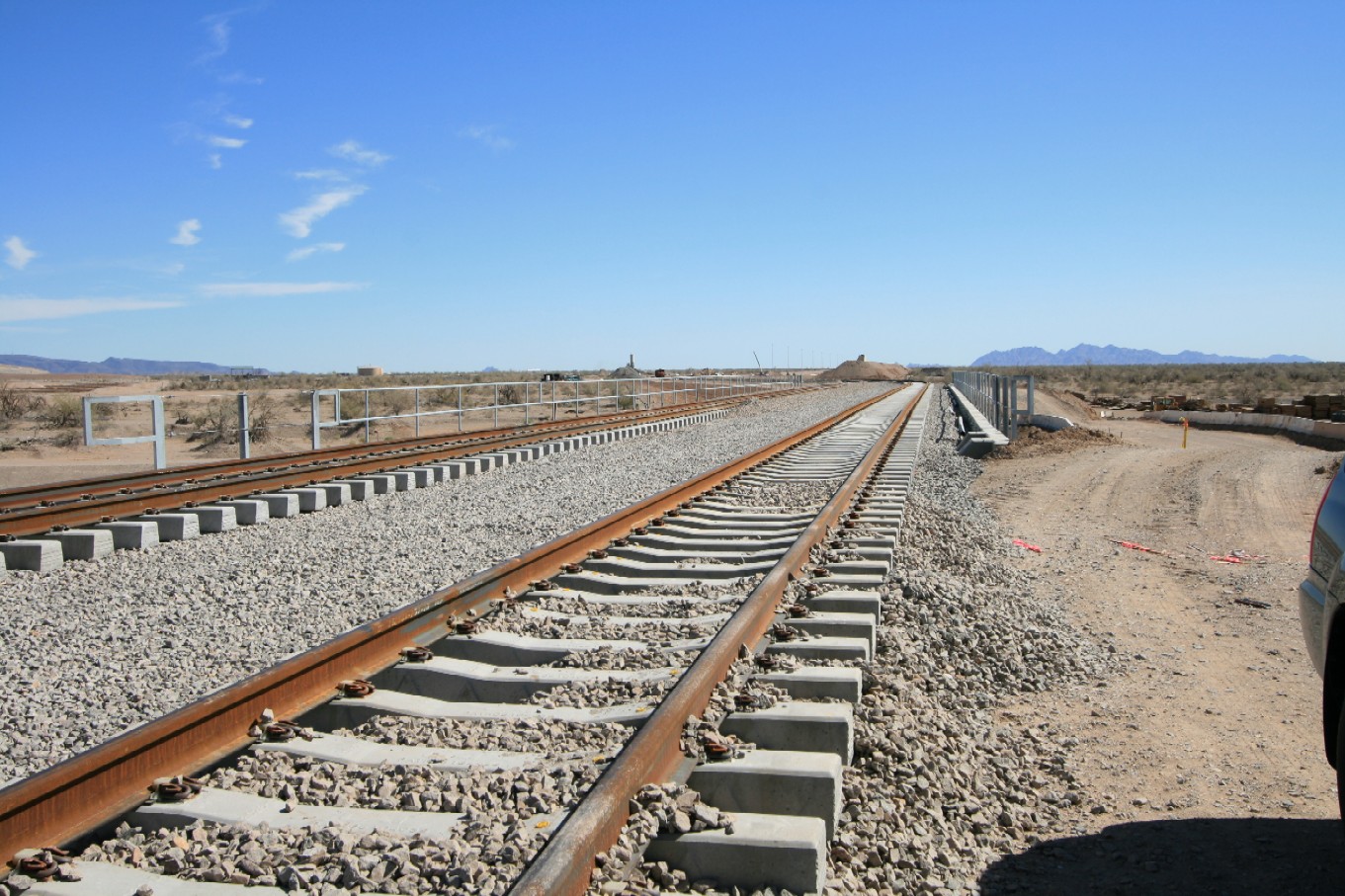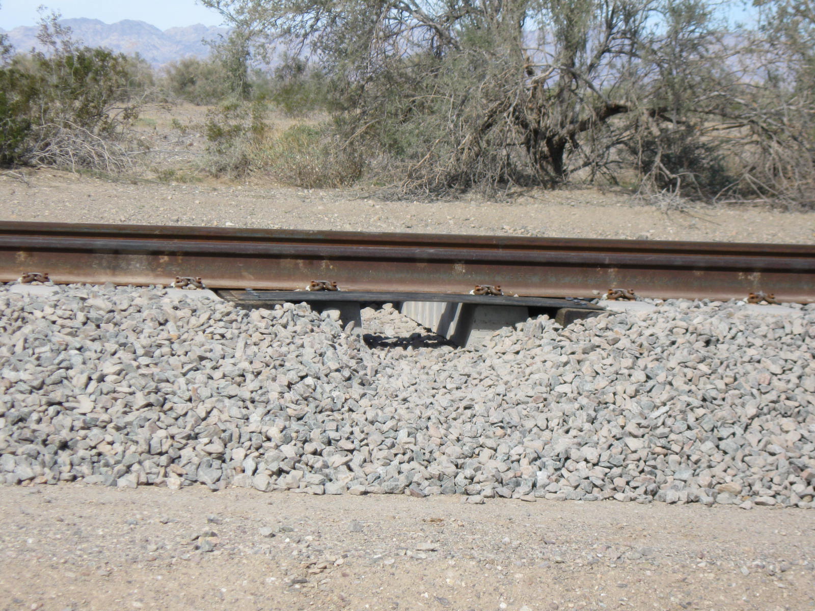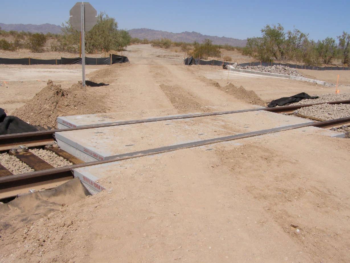 September 2010 Three desert road crossings are constructed along the rail spur between the mainline and the landfill to provide continued access to the desert north of the tracks .