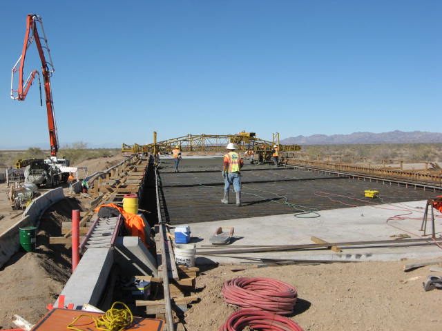 January 2011 Coffman Specialty, Inc. crews smooth a cement deck into place on the railroad bridge built over the stormwater drain on the western edge of the Mesquite Regional Landfill.