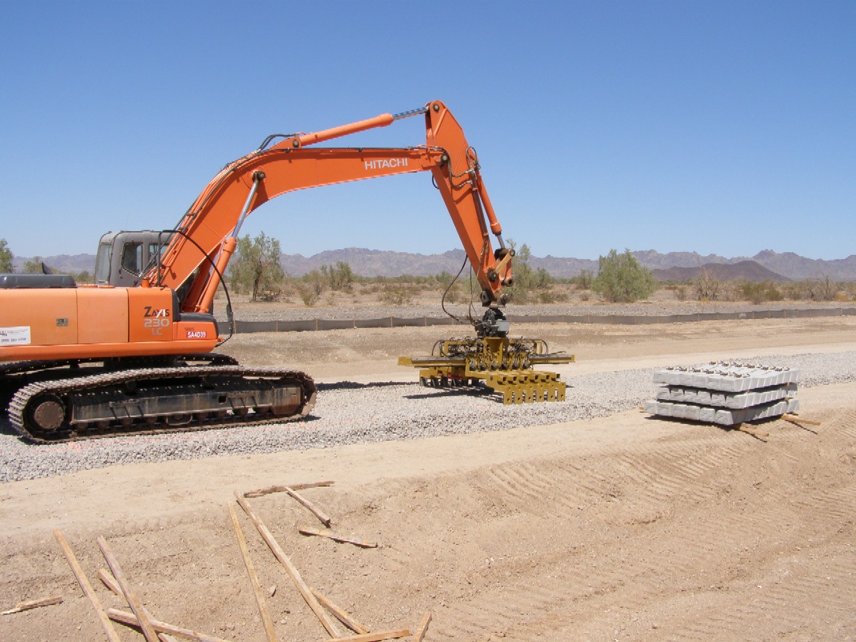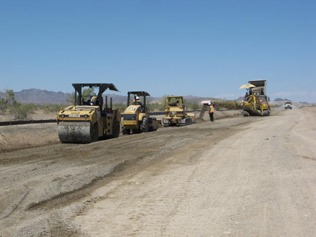July 2010 A fleet ofheavy equipment compacts soil cement along the route where the rail spur is being constructed to haul waste by rail from the Los Angeles area to the Mesquite Regional Landfill.