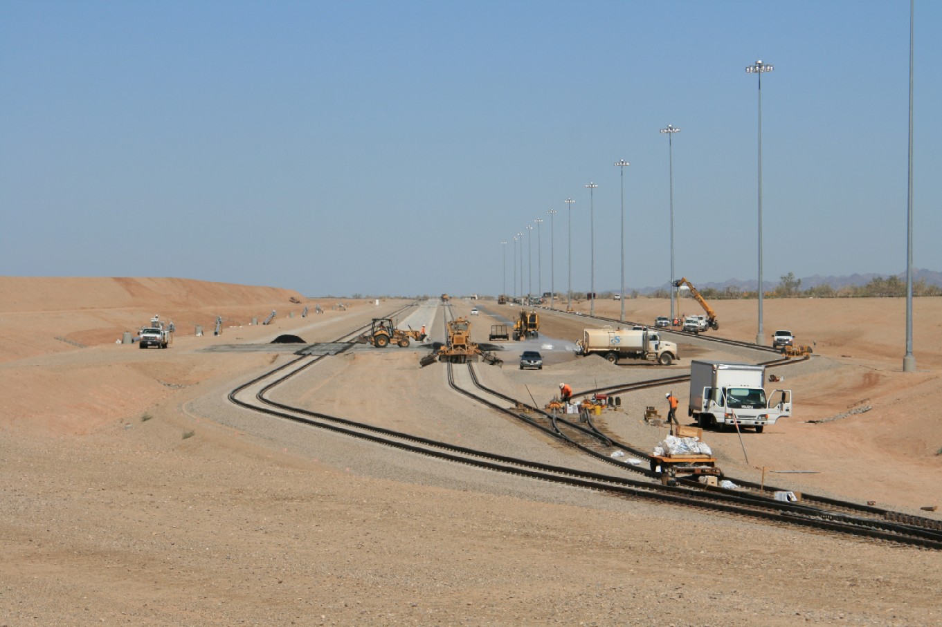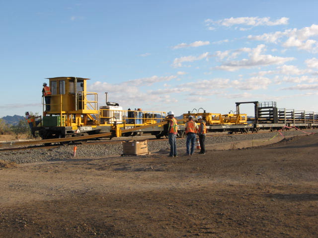 October 2010 Crews install a section of rail along the rail spur being constructed to connect the Mesquite Regional Landfill with the Union Pacific mainline north of Glamis.