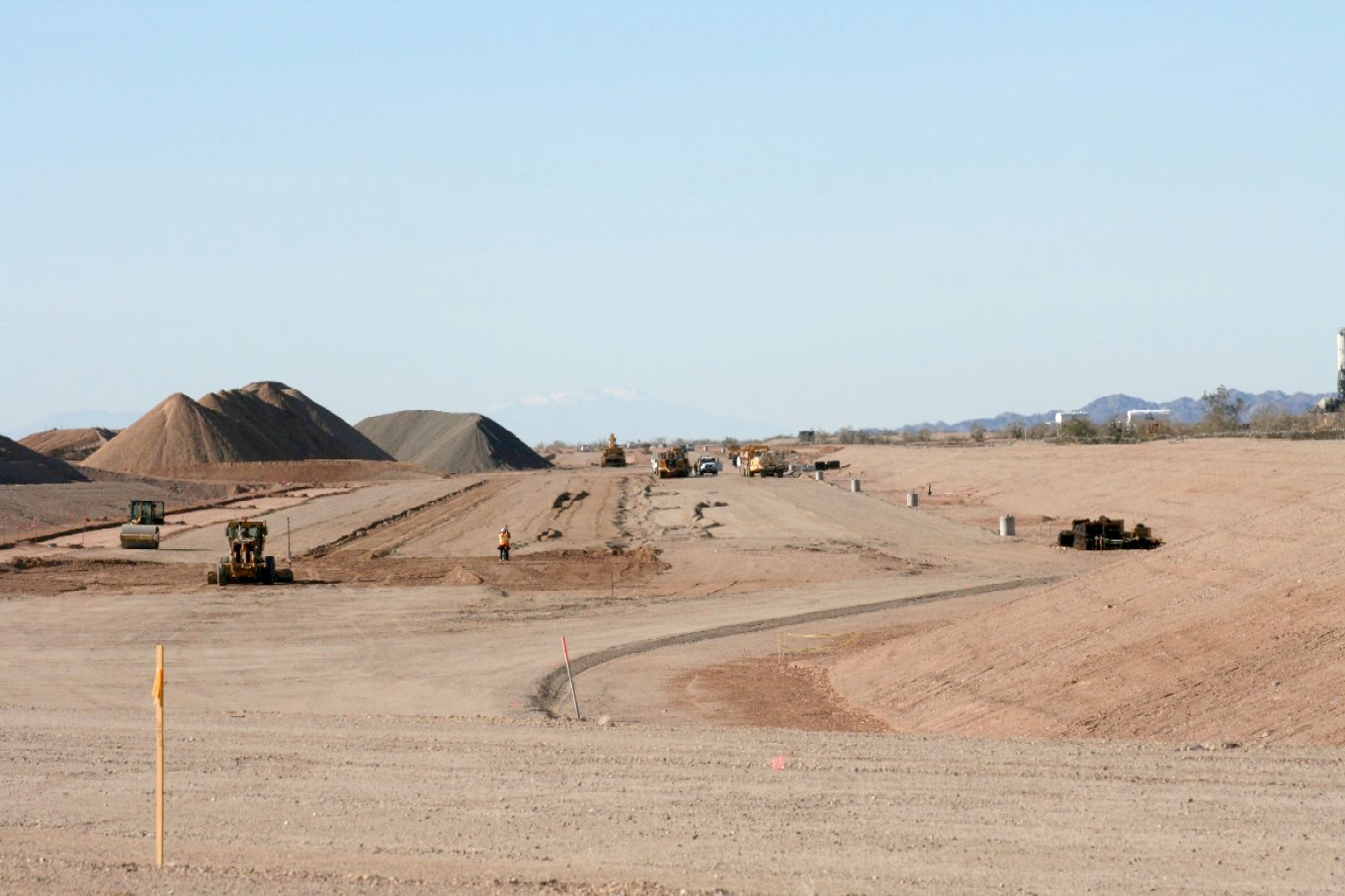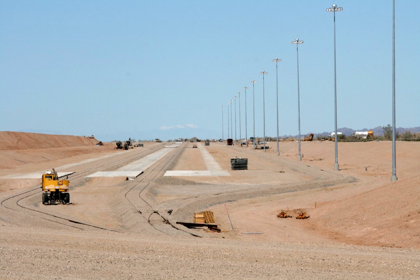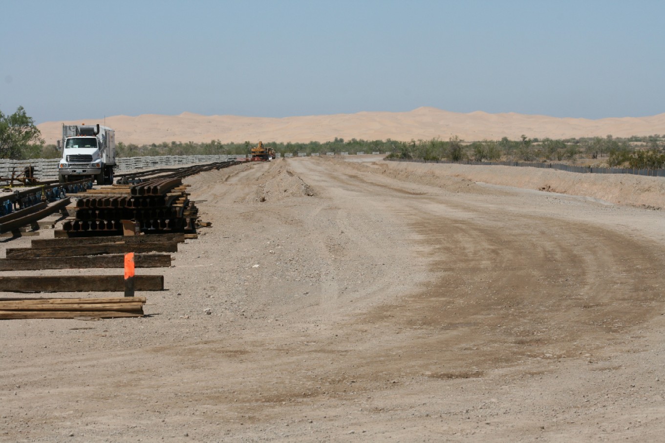 July 2010 The route of the 4.5 mile rail spur from the Union Pacific mainline north of Glamis to the Mesquite Regional Landfill is graded. Rail and ties are stacked and ready for installation.