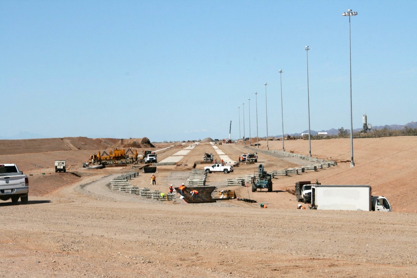 February 2011 Concrete pads are placed to provide the surface upon which cranes will travel to load and unload double-stacked rail cars. The north bank of lights (right) that will illuminate the rail yard are visible. And, concrete rail ties are stacked (foreground) awaiting installation.